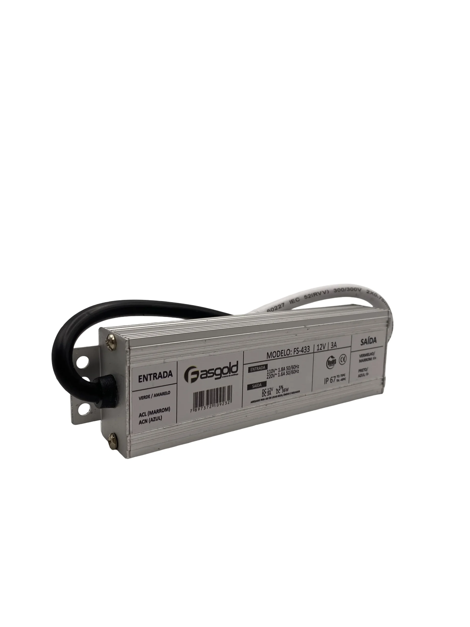 A fonte de alimentação FS-433 possui entrada bivolt automática, com saída de 12 VDC e consumo de até 3 A. Construção Blindada (IP67): Desenvolvida para resistir