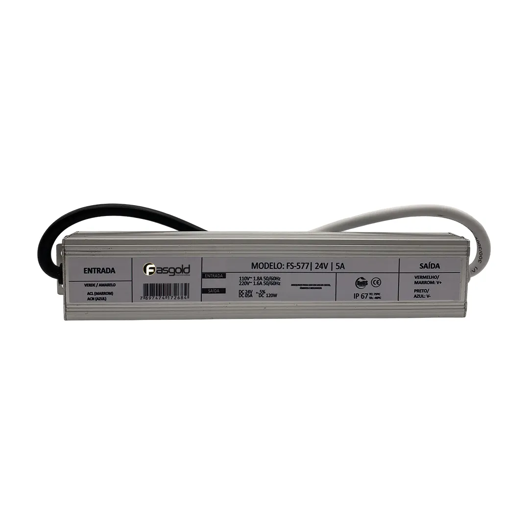 A fonte de alimentação FS-577 possui entrada bivolt automática, com saída de 24 VDC e consumo de até 5 A. Construção Blindada (IP67): Desenvolvida para resistir a ambientes exigentes, oferecendo proteção