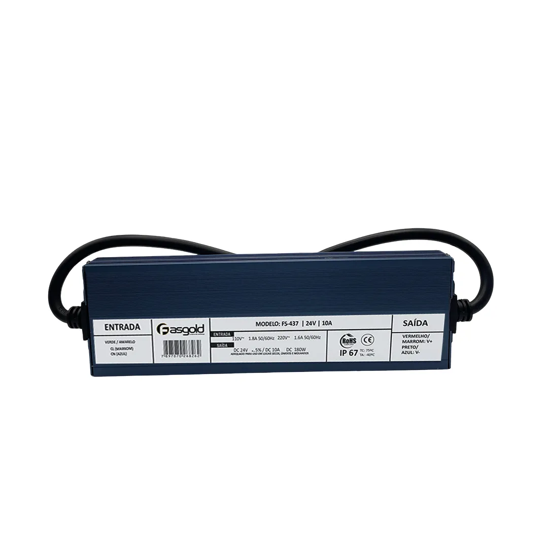 A fonte de alimentação FS-437 possui entrada bivolt automática, com saída de 24 VDC e consumo de até 10A. Construção Blindada (IP67): Desenvolvida para resistir a ambientes exigentes, oferecendo proteção superior