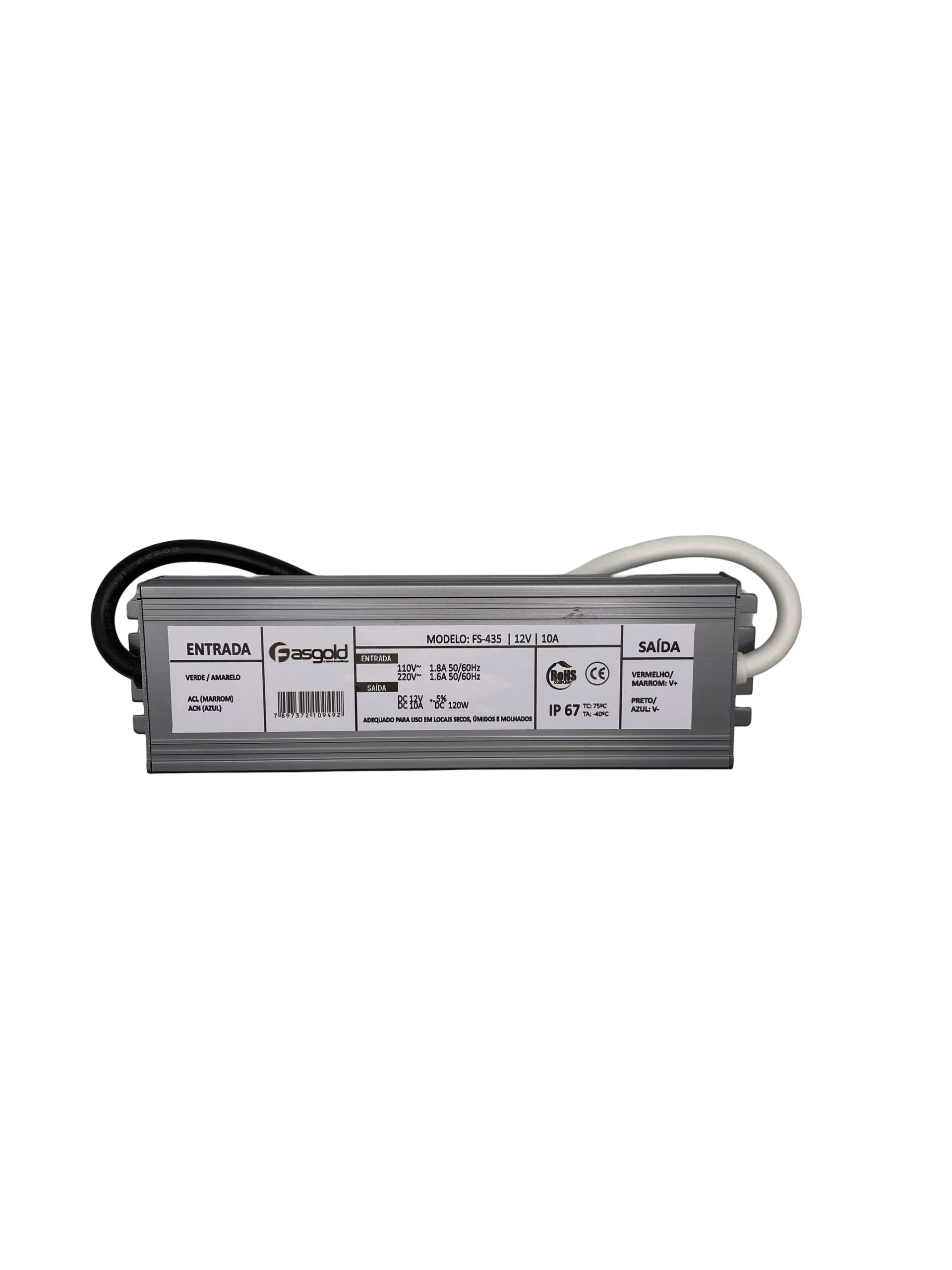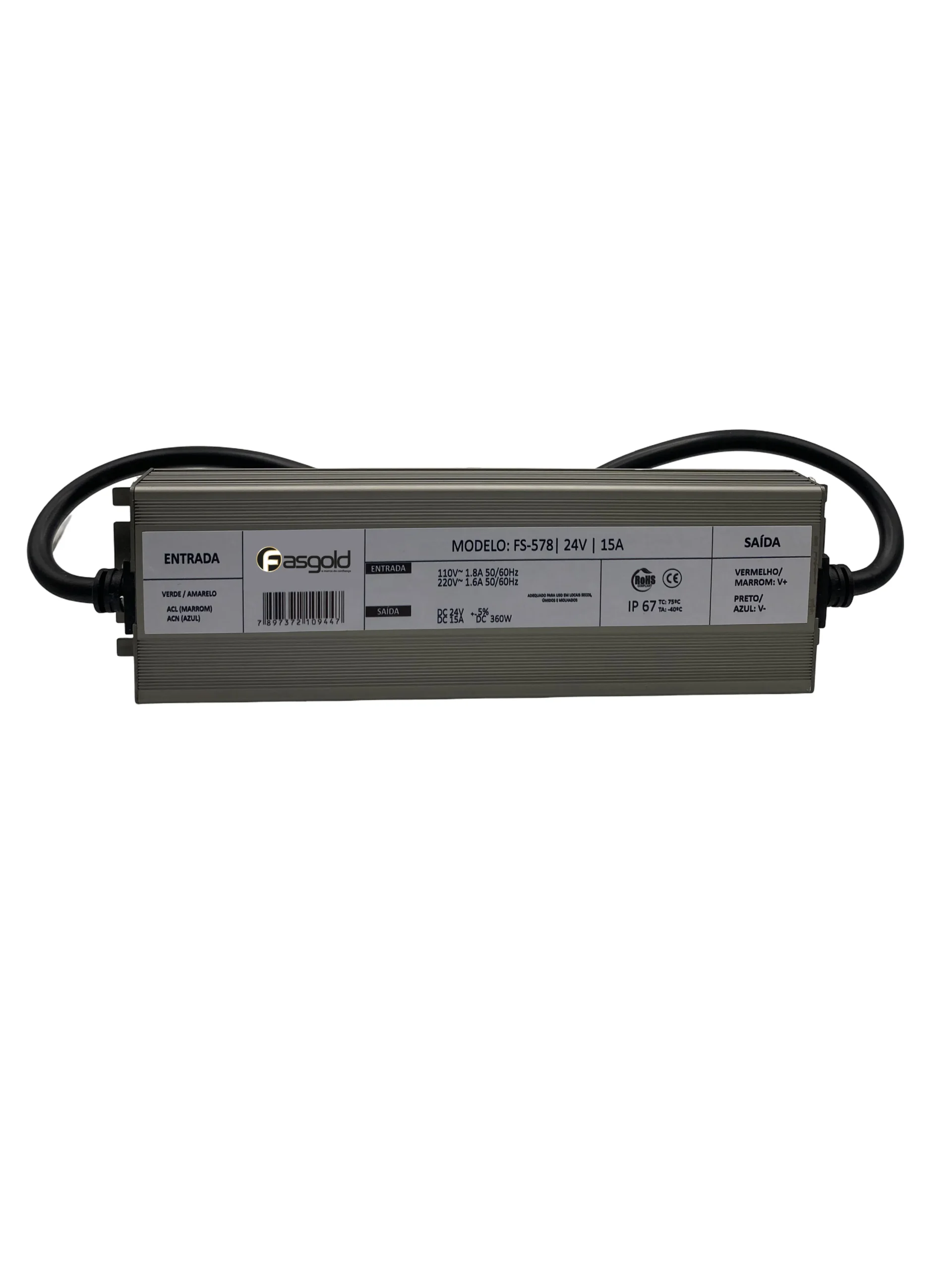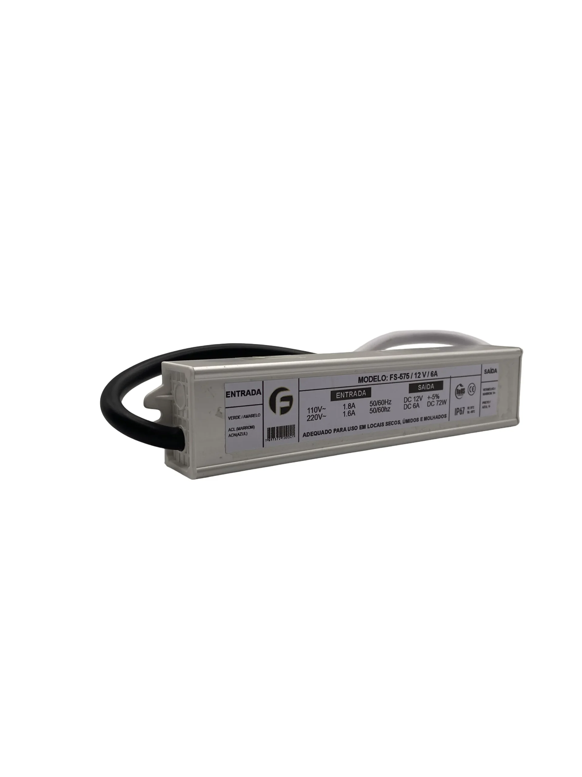 A fonte de alimentação FS-575 possui entrada bivolt automática, com saída de 12 VDC e consumo de até 6 A. Construção Blindada (IP67): Desenvolvida para resistir