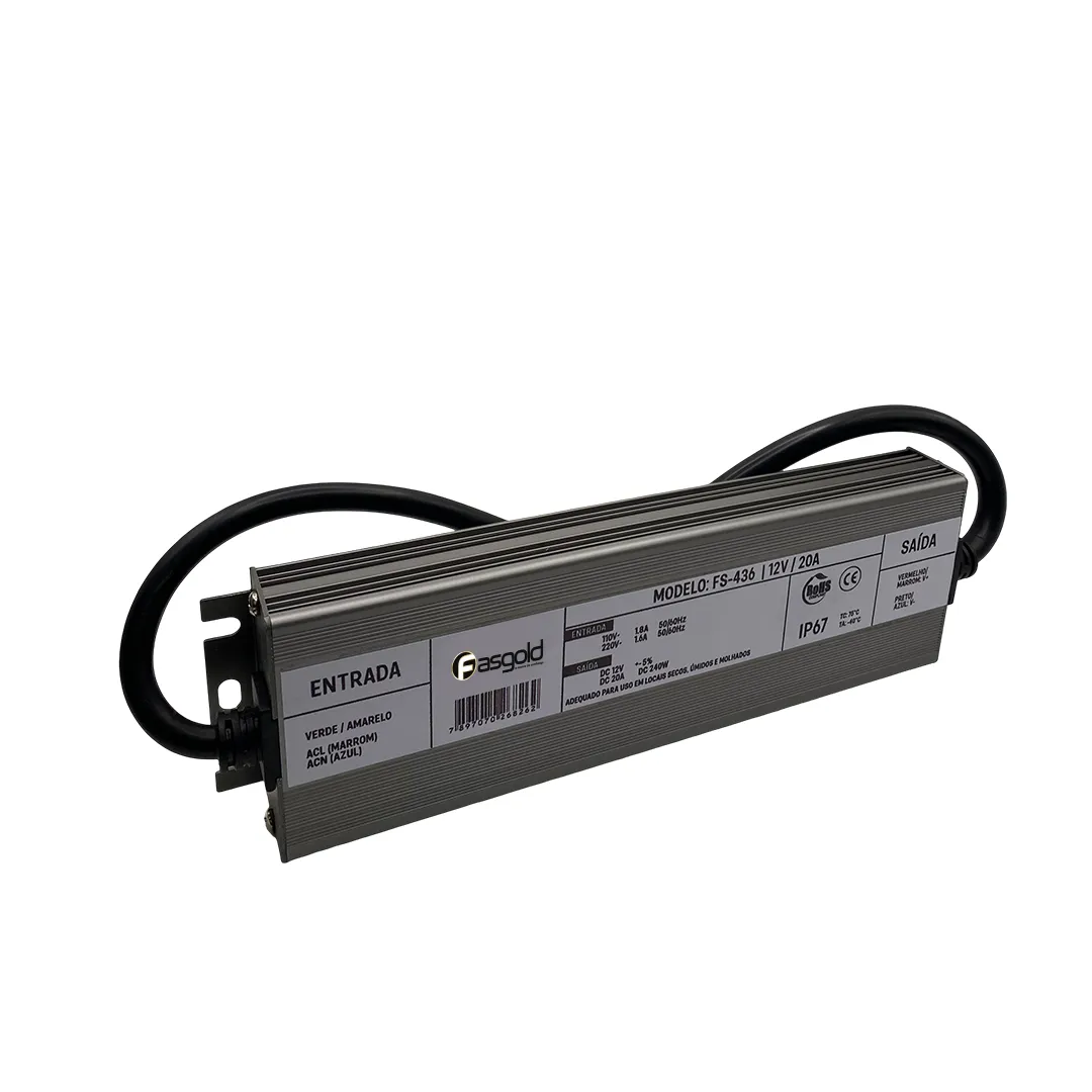 A fonte de alimentação FS-436 possui entrada bivolt automática, com saída de 12 VDC e consumo de até 20A. Construção Blindada (IP67): Desenvolvida para resistir a ambientes exigentes, oferecendo proteção