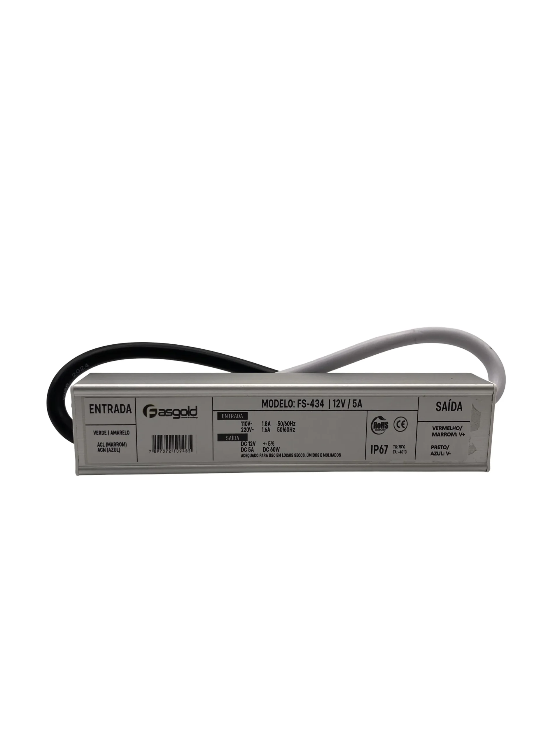 A fonte de alimentação FS-434 possui entrada bivolt automática, com saída de 12 VDC e consumo de até 5 A. Construção Blindada (IP67): Desenvolvida para resistir